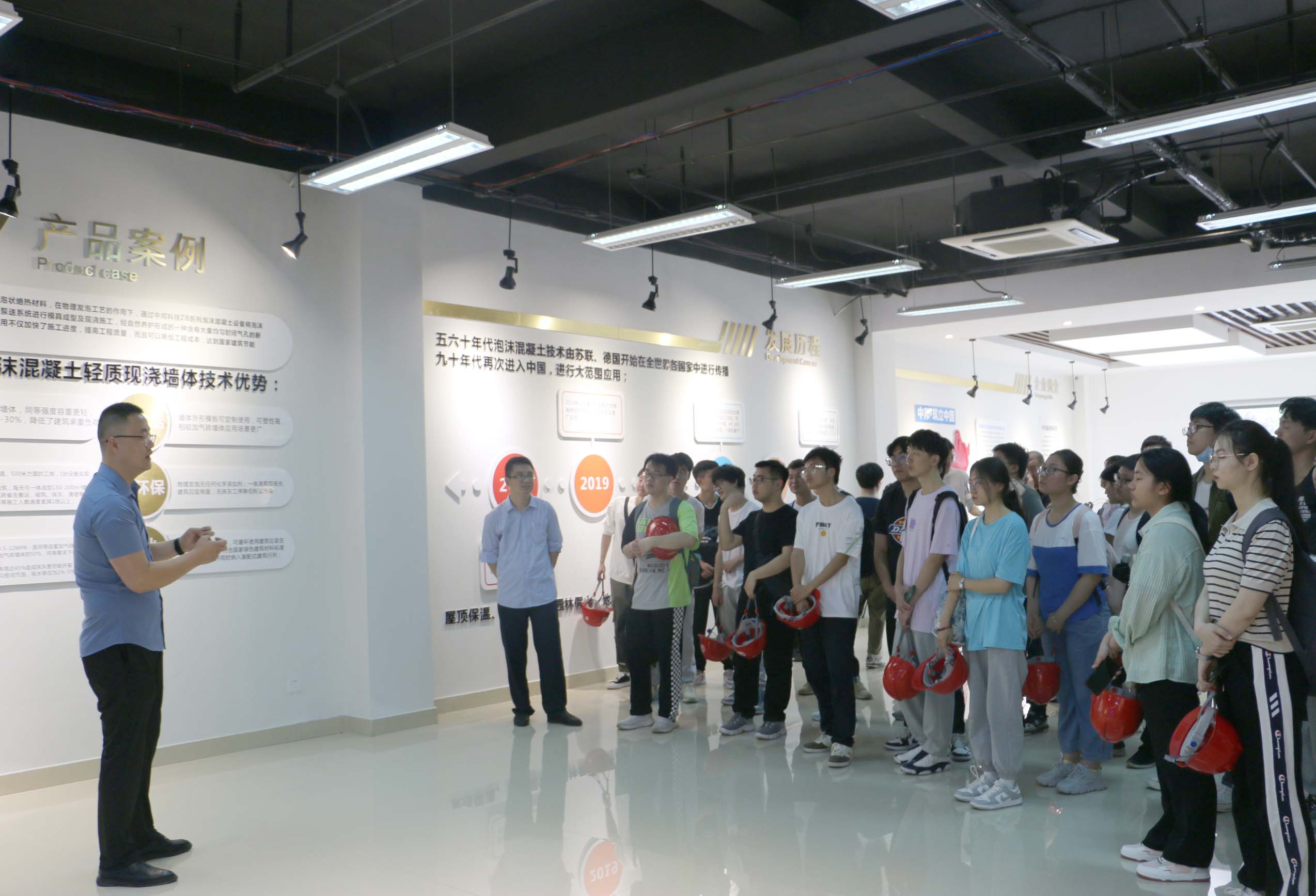為便于此次實習考察師生全面的了解泡沫混凝土產品優勢與廣闊的市場前景,中邦公司業務部高經理為老師同學們詳細的講解了我司的規模現狀、發展理念與未來規劃,講解同時還帶領同學們參觀了我司展廳的現澆輕質泡沫混凝土樣板墻以及各種不同用途(保溫、回填、海綿城市等不同用途)的泡沫混凝土樣塊,詳細的從輕質化、施工效率快、綠色節能環保、固廢處理、產品耐久性強等方面介紹我司產品,提高了同學們對我司所經營相關產品的認知。在展廳參觀講解完成后公司業務部同事還分別以視頻的形式詳細的為老師和同學們分解剖析我司產品的市場應用以及社會發展前景,使同學們更進一步的了解我們產品的起源發展及未來的市場前景和市場發展趨勢。