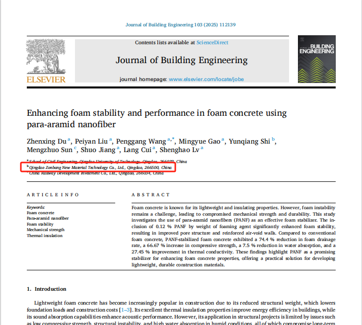 近日,青島中邦新材料科技有限公司聯合青島理工大學在材料科學研究領域取得重大突破,關于納米發泡混凝土技術的論文成功發表于國際知名期刊《Journal of Building Engineering》。這一成果標志著公司在納米發泡劑領域的研究達到了國際領先水平。