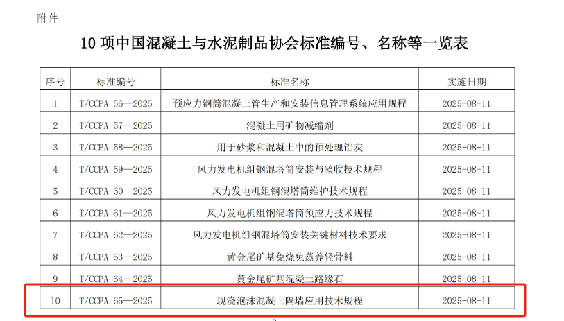 2025年4月11日,中國混凝土與水泥制品協(xié)會正式批準發(fā)布了《現(xiàn)澆泡沫混凝土隔墻應(yīng)用技術(shù)規(guī)程》(T/CCPA 65—2025)等10項協(xié)會標(biāo)準。該標(biāo)準由我司主導(dǎo)編制,標(biāo)志著我司在泡沫混凝土技術(shù)領(lǐng)域的領(lǐng)先地位和行業(yè)貢獻得到了權(quán)威認可。