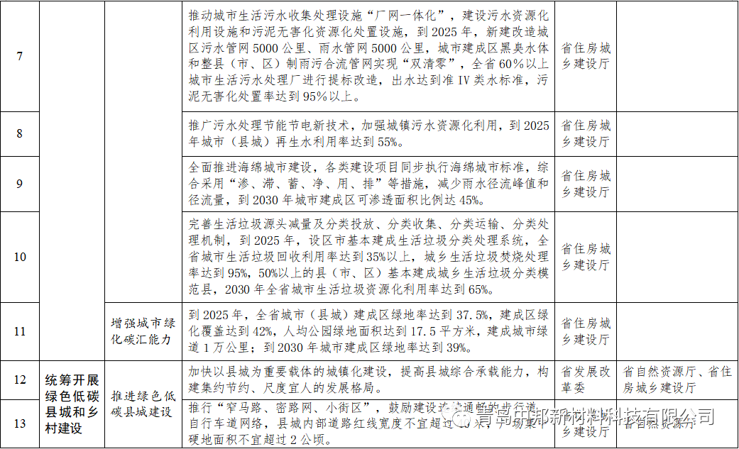 (七)提高城鎮(zhèn)基礎(chǔ)設(shè)施運(yùn)行效率。加強(qiáng)供熱、供氣、供水等市政基礎(chǔ)設(shè)施智能化建設(shè)管理,推進(jìn)地下綜合管廊建設(shè)及清潔熱源、供熱管網(wǎng)等建設(shè)改造,到2025年新增地下綜合管廊120公里,到2030年城市供熱管網(wǎng)熱損失比2020年下降5個(gè)百分點(diǎn)。推進(jìn)節(jié)水型城市建設(shè),加大城市老舊供水管網(wǎng)改造力度,到2025年,設(shè)區(qū)市全部創(chuàng)建國家節(jié)水型城市,城市公共供水管網(wǎng)漏損率控制在7.9%以內(nèi)。推動(dòng)城市生活污水收集處理設(shè)施廠網(wǎng)一體化,建設(shè)污水資源化利用設(shè)施和污泥無害化資源化處置設(shè)施,到2025年,新建改造城區(qū)污水管網(wǎng)5000公里、雨水管網(wǎng)5000公里,城市建成區(qū)黑臭水體和整縣(市、區(qū))制雨污合流管網(wǎng)實(shí)現(xiàn)雙清零,全省60%以上城市生活污水處理廠進(jìn)行提標(biāo)改造,出水達(dá)到準(zhǔn)IV類水標(biāo)準(zhǔn),污泥無害化處置率達(dá)到95%以上。推廣污水處理節(jié)能節(jié)電新技術(shù),加強(qiáng)城鎮(zhèn)污水資源化利用,到2025年城市(縣城)再生水利用率達(dá)到55%。全面推進(jìn)海綿城市建設(shè),各類建設(shè)項(xiàng)目同步執(zhí)行海綿城市標(biāo)準(zhǔn),綜合采用滲、滯、蓄、凈、用、排等措施,減少雨水徑流峰值和徑流量,到2030年城市建成區(qū)可滲透面積比例達(dá)45%。完善生活垃圾源頭減量及分類投放、分類收集、分類運(yùn)輸、分類處理機(jī)制,到2025年,設(shè)區(qū)市基本建成生活垃圾分類處理系統(tǒng),全省城市生活垃圾回收利用率達(dá)到35%以上,城鄉(xiāng)生活垃圾焚燒處理率達(dá)到95%,50%以上的縣(市、區(qū))基本建成城鄉(xiāng)生活垃圾分類模范縣,2030年全省城市生活垃圾資源化利用率達(dá)到65%。推進(jìn)城市綠色照明,推廣遙測(cè)、遙控、遙信等路燈智能控制系統(tǒng),合理控制景觀照明,節(jié)能型燈具應(yīng)用率保持在100%,到2030年,30%以上城市建成照明數(shù)字化系統(tǒng),LED等高效燈具普及率達(dá)到80%以上。