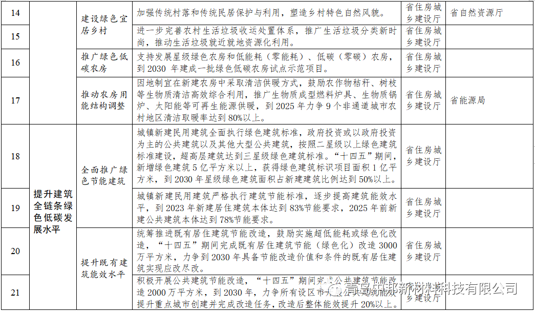 (十三)全面推廣綠色節(jié)能建筑。研究制訂不同類型建筑的綠色建筑標(biāo)準(zhǔn)規(guī)范,積極采用自然通風(fēng)、天然采光、隔音降噪等融合生態(tài)共享理念的建筑設(shè)計(jì)方式。城鎮(zhèn)新建民用建筑全面執(zhí)行綠色建筑標(biāo)準(zhǔn),政府投資或以政府投資為主的公共建筑以及其他大型公共建筑,按照二星級(jí)以上綠色建筑標(biāo)準(zhǔn)建設(shè),超高層建筑達(dá)到三星級(jí)綠色建筑標(biāo)準(zhǔn)。推動(dòng)城市新區(qū)按照綠色生態(tài)城區(qū)標(biāo)準(zhǔn)規(guī)劃、建設(shè),支持有條件的地區(qū)創(chuàng)建國家綠色低碳相關(guān)試點(diǎn)示范,適時(shí)開展省級(jí)綠色低碳城市建設(shè)試點(diǎn)。十四五期間,新增綠色建筑5億平方米以上,獲得綠色建筑標(biāo)識(shí)項(xiàng)目面積1億平方米,到2030年星級(jí)綠色建筑面積占新建建筑比例達(dá)到50%以上。城鎮(zhèn)新建民用建筑嚴(yán)格執(zhí)行建筑節(jié)能標(biāo)準(zhǔn),逐步提高建筑能效水平,到2023年新建居住建筑本體達(dá)到83%節(jié)能要求,2025年前新建公共建筑本體達(dá)到78%節(jié)能要求。加快推動(dòng)近零能耗建筑及低碳建筑、零碳建筑建設(shè),積極發(fā)展產(chǎn)能建筑,鼓勵(lì)有條件的市及城市新區(qū)等建設(shè)超低能耗(近零能耗)建筑、低碳(零碳)建筑集中連片示范區(qū)。