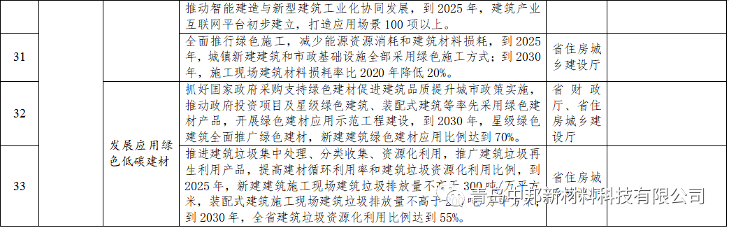 (十八)發(fā)展應(yīng)用綠色低碳建材。推行綠色建材認(rèn)證,重點(diǎn)推廣高性能混凝土、高強(qiáng)鋼筋、高效保溫材料、節(jié)能中空門窗、結(jié)構(gòu)保溫一體化墻板等技術(shù)產(chǎn)品。抓好國家政府采購支持綠色建材促進(jìn)建筑品質(zhì)提升城市政策實(shí)施,推動(dòng)政府投資項(xiàng)目及星級(jí)綠色建筑、裝配式建筑等率先采用綠色建材產(chǎn)品,開展綠色建材應(yīng)用示范工程建設(shè),到2030年,星級(jí)綠色建筑全面推廣綠色建材,新建建筑綠色建材應(yīng)用比例達(dá)到70%。大力發(fā)展性能優(yōu)良的預(yù)制構(gòu)件和部品,加大通用尺寸預(yù)制構(gòu)件和部品生產(chǎn)應(yīng)用,提高智能化、標(biāo)準(zhǔn)化水平。推進(jìn)建筑垃圾集中處理、分類收集、資源化利用,推廣建筑垃圾再生利用產(chǎn)品,提高建材循環(huán)利用率和建筑垃圾資源化利用比例,到2025年,新建建筑施工現(xiàn)場(chǎng)建筑垃圾排放量不高于300噸/萬平方米,裝配式建筑施工現(xiàn)場(chǎng)建筑垃圾排放量不高于200噸/萬平方米;到2030年,全省建筑垃圾資源化利用比例達(dá)到55%。